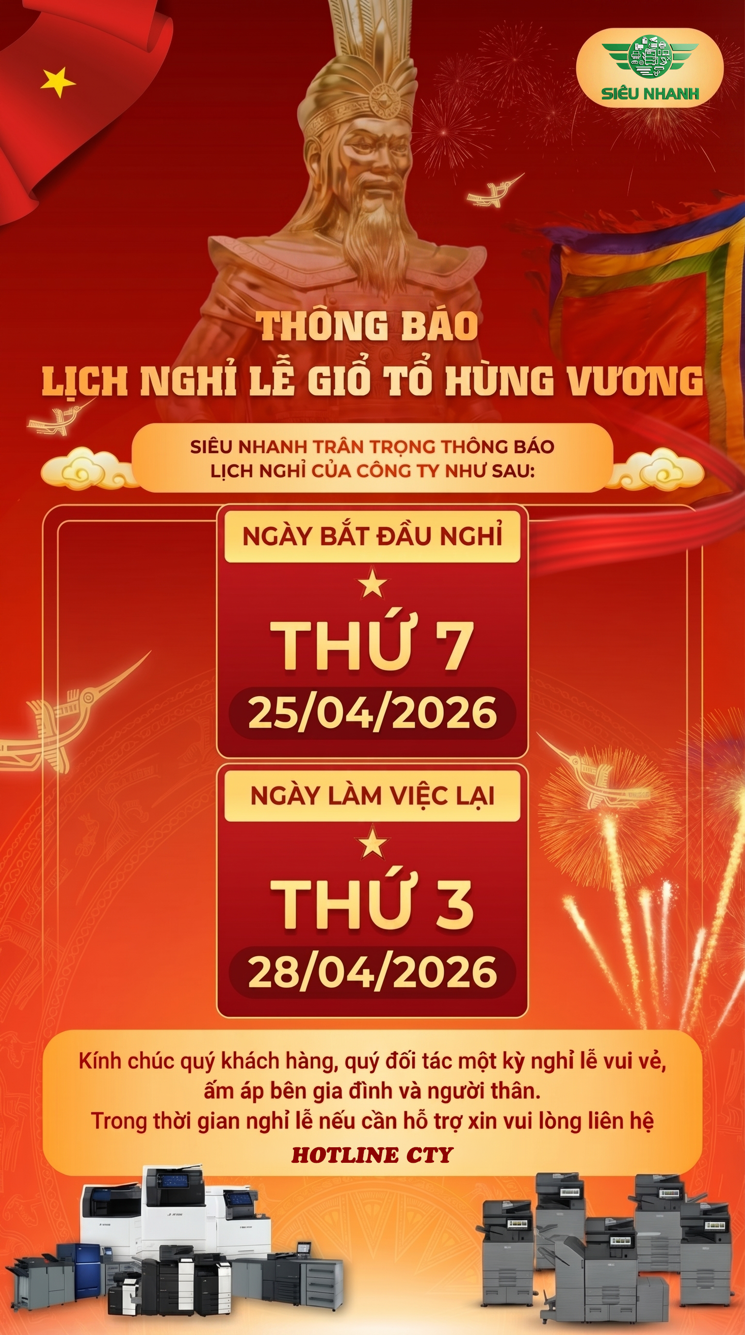 Để thuận tiện cho việc liên hệ công tác và hỗ trợ dịch vụ, Siêu Nhanh trân trọng thông báo lịch nghỉ lễ Giỗ Tổ Hùng Vương và Ngày Giải phóng miền Nam 30/4 - Quốc tế Lao động 1/5 năm 2026 cụ thể như sau:
